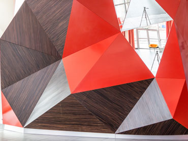 У даному проекті об’єднані в одне ціле кілька видів панелей: 3d панелі, що імітують природні поверхні (деревину), яскраві червоні панелі і дзеркальні. Разом вони утворюють незвичайний декоративний ефект «живих» стін. Крім того, 3d панелі під різним кутом освітлення виглядають зовсім по-різному.