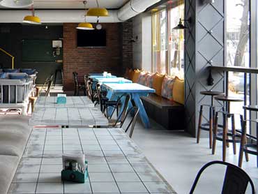 Меблі для кафе виготовлені з металу і масиву дерева, це ефектне поєднання створює окремий візуальний вимір, привертаючи увагу до барної стійки.